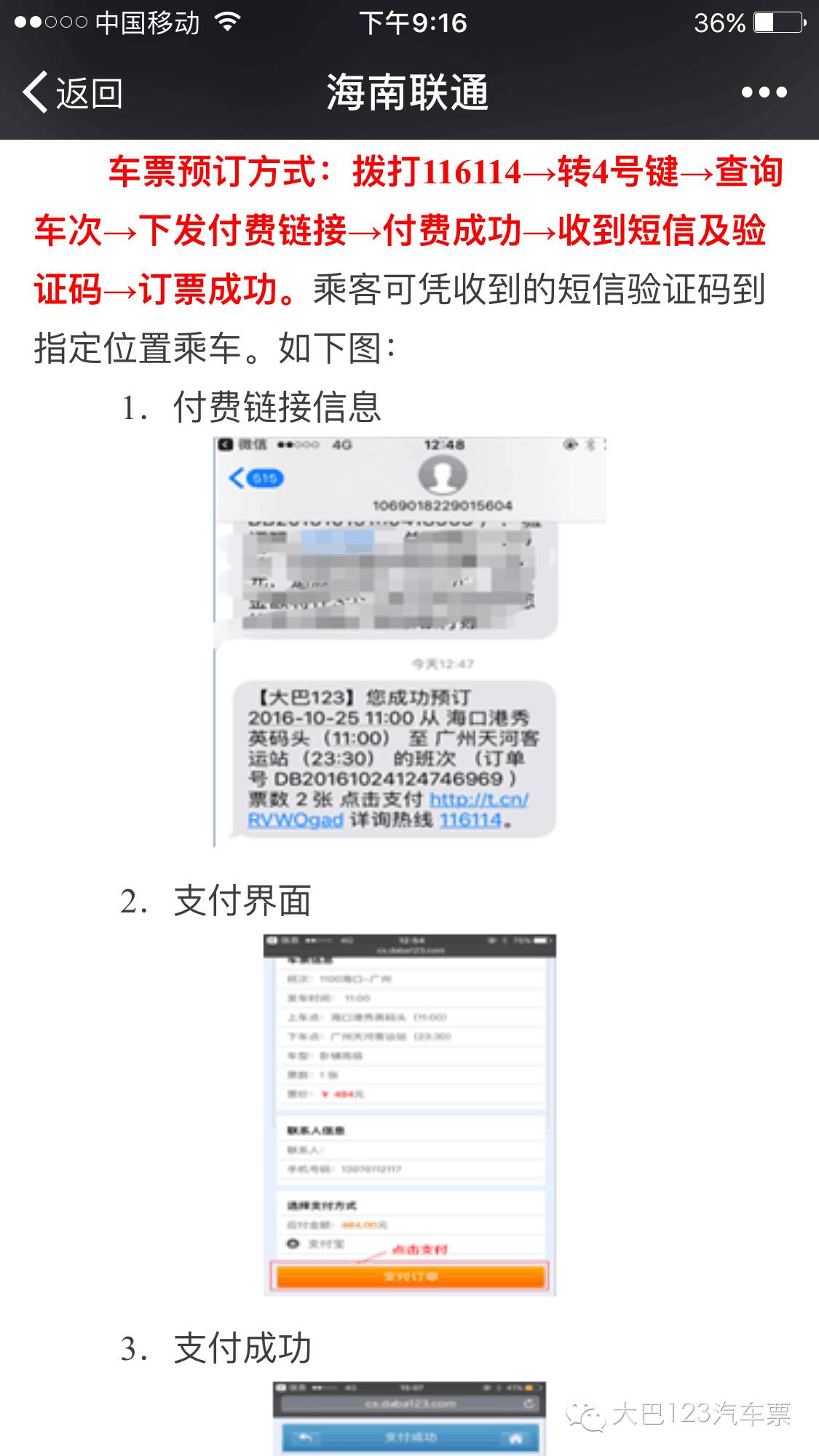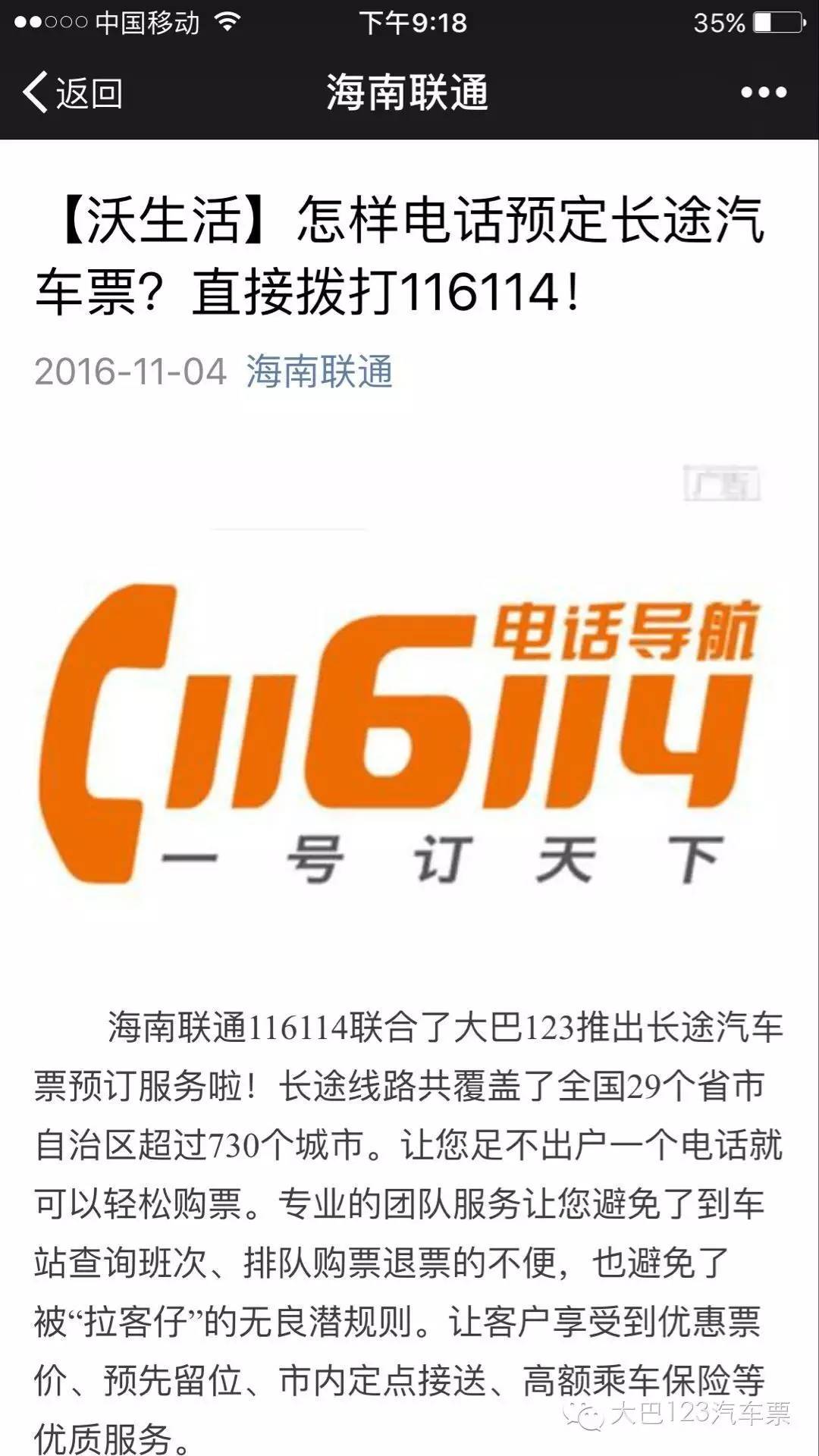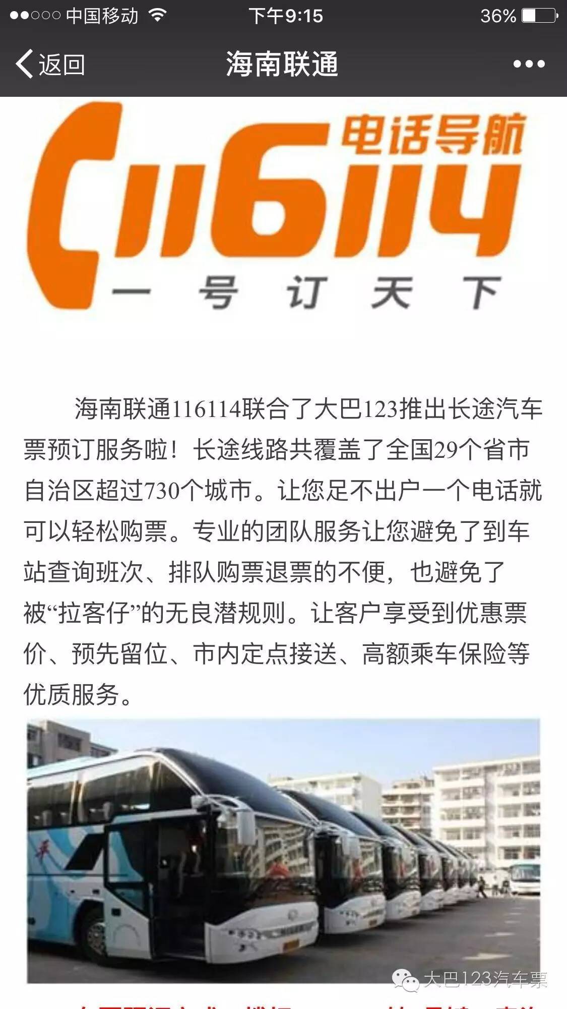 如今,大巴123汽車票與海南聯通116114合作了,不僅可以在微信上購買汽車票,也可以用電話預定汽車票。