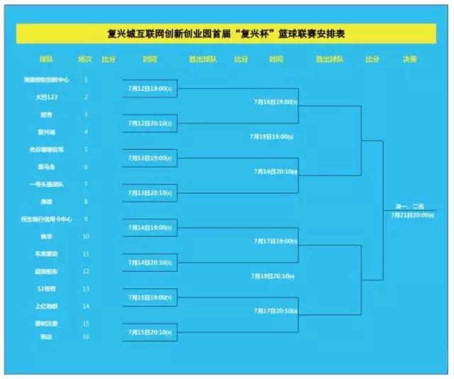本次比賽首輪對(duì)陣為:海南微軟創(chuàng)新中心VS大巴123、酷秀VS復(fù)興城、光谷嘟嘟自駕VS黑馬會(huì)、一號(hào)頭狼戰(zhàn)隊(duì)VS果噥、民生銀行信用卡中心VS楓華、車(chē)庫(kù)愛(ài)動(dòng)聯(lián)隊(duì)VS超級(jí)船東、52微幫VS上億物聯(lián)、香樹(shù)沉香VS衡達(dá)。比賽采用單敗淘汰制,勝者進(jìn)入八強(qiáng),負(fù)者出局,直至決出所有名次。
