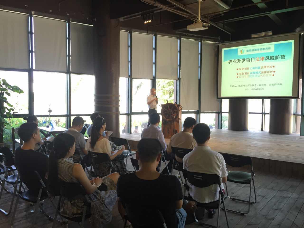 本次培訓主題為“農業開發項目法律風險防范”,肖律師從農業項目土地問題法律評析、農業項目眾籌模式法律評析和農業項目投資評估風險管理三部分展開培訓,開頭詳細介紹了與農業項目開發相關的土地法律法規和土地使用法律風險,并伴以生動翔實的案例為在場企業代表作了說明。緊接著,肖律師從眾籌的平臺型、消費型和權益型三大類商業模式講解農業眾籌,闡述了農業大投資、長周期、高風險的行業屬性。最后,肖律師從農業項目投資管理風險特征、風險類型和防范對策幫助企業詳細了解國家政策傾斜、資金投入和銀行信貸扶持對農企發展的重要性。