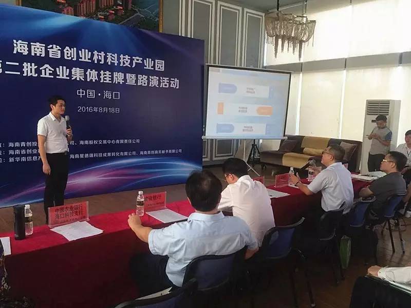 8月23日上午,海南股權交易中心聯合海南青創投資管理有限公司在海南省創業村科技產業園舉辦第二批企業集體掛牌儀式暨路演活動。這也是繼創業村科技產業園服務中心正式運營以來的首場重要活動。