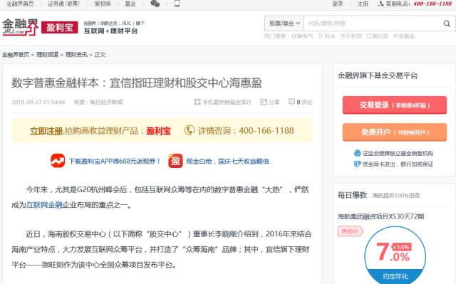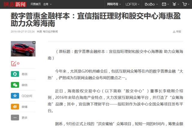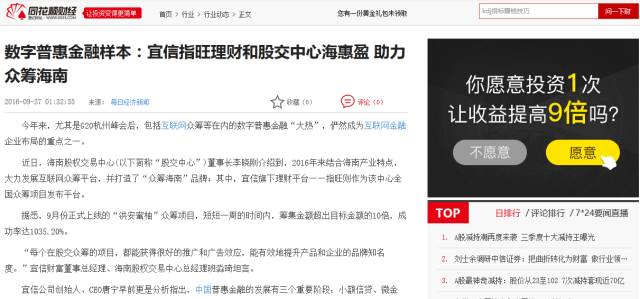 近日,海南股權(quán)交易中心(以下簡(jiǎn)稱(chēng)“股交中心”)董事長(zhǎng)李曉剛介紹到,2016年來(lái)結(jié)合海南產(chǎn)業(yè)特點(diǎn),大力發(fā)展互聯(lián)網(wǎng)眾籌平臺(tái),并打造了“眾籌海南”品牌;其中,宜信旗下理財(cái)平臺(tái)——指旺則作為該中心全國(guó)眾籌項(xiàng)目發(fā)布平臺(tái)。