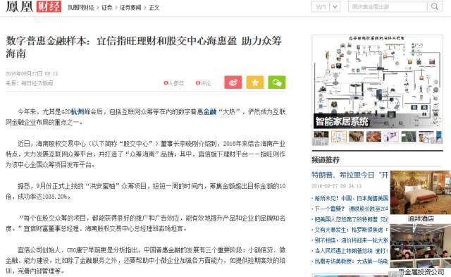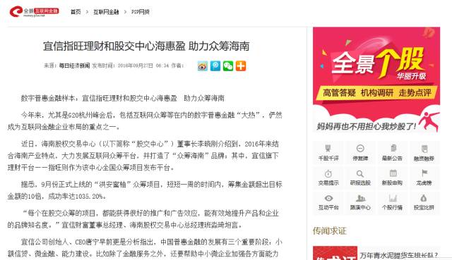 9月23日,海南股權(quán)交易中心在椰城??谂e辦“數(shù)字金融在海南暨互聯(lián)網(wǎng)+農(nóng)業(yè)研討會(huì)”,研討會(huì)上討論了多項(xiàng)重要議題,尤其是“眾籌海南”項(xiàng)目,受到了高度關(guān)注。國(guó)內(nèi)主流財(cái)經(jīng)媒體《每日經(jīng)濟(jì)新聞》以《數(shù)字普惠金融樣本:宜信指旺理財(cái)和股交中心?;萦Ρ娀I海南》對(duì)本次研討會(huì)做了重要報(bào)道,文章刊發(fā)后,被新浪、網(wǎng)易、金融界、鳳凰、全景網(wǎng)、同花順財(cái)經(jīng)等主流媒體網(wǎng)站轉(zhuǎn)載。