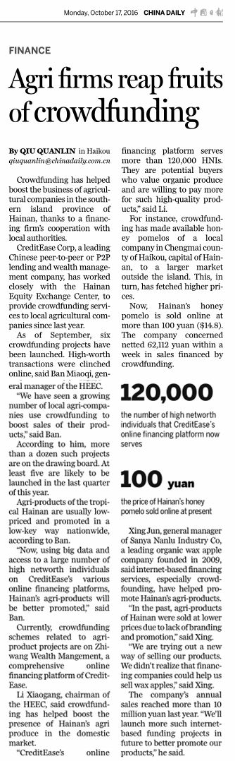 10月17日,國家英文日報《China Daily》刊發文章《Agri firms reap fruits of crowdfunding》,對海南股權交易中心“眾籌海南”項目進行了深入的報道。
