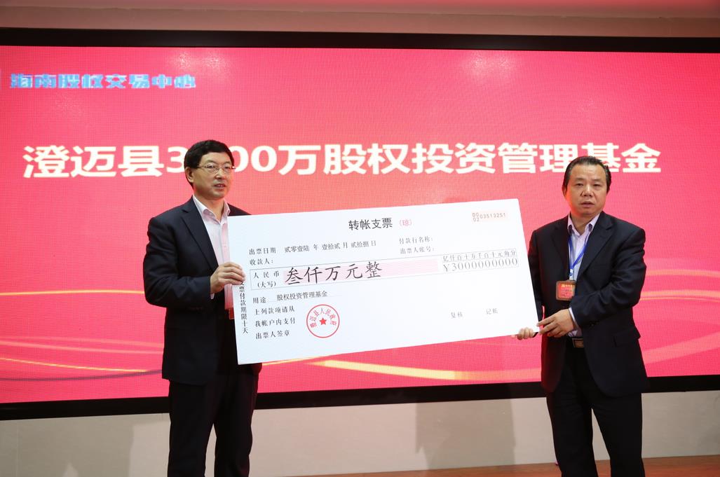 為了加強澄邁縣與股交中心的合作,現場,鄭奮與李曉剛共同簽署了戰略合作協議。隨后,楊思濤代表澄邁縣政府向海南控股發放澄邁縣3000萬股權投資管理資金,并由柳松華代表海南控股接收。