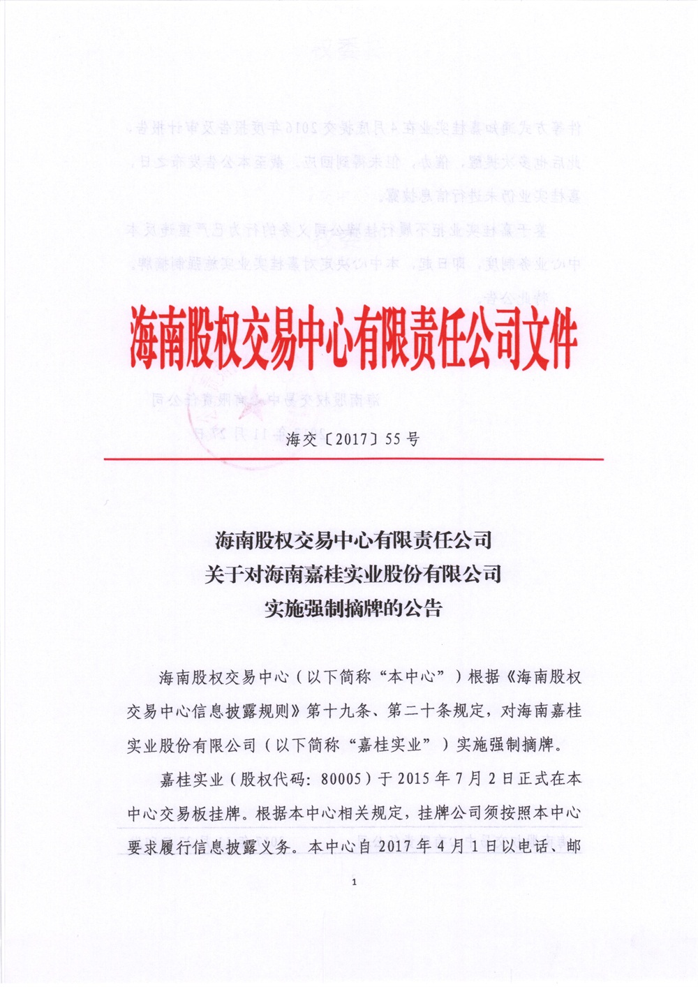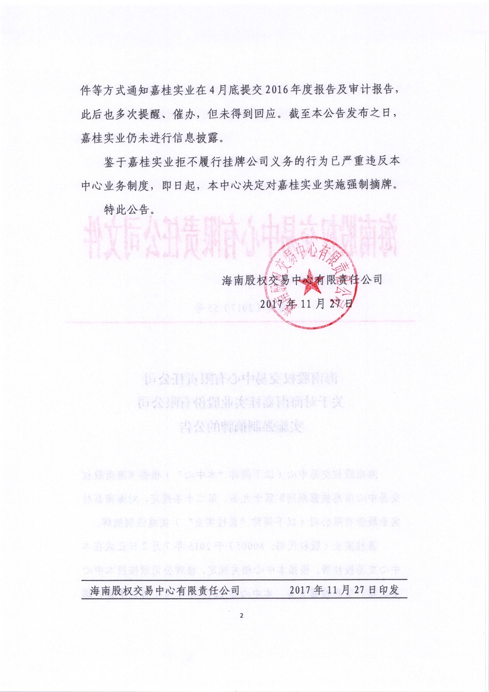 80005嘉桂實業:關于對海南嘉桂實業股份有限公司實施強制摘牌的公告
