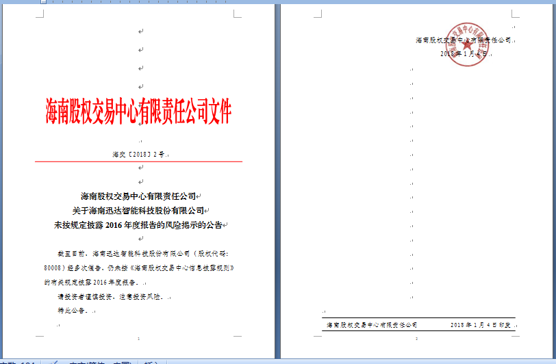 海南股權交易中心有限責任公司關于海南迅達智能科技股份有限公司未按規定披露2016年度報告的風險揭示的公告