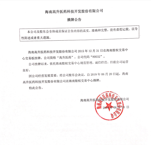 80032高升醫藥:海南高升醫藥科技開發股份有限公司摘牌公告