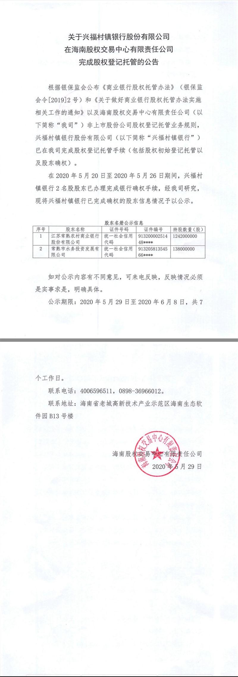 興福村鎮銀行股份有限公司在海南股權交易中心進行股權登記托管的公告