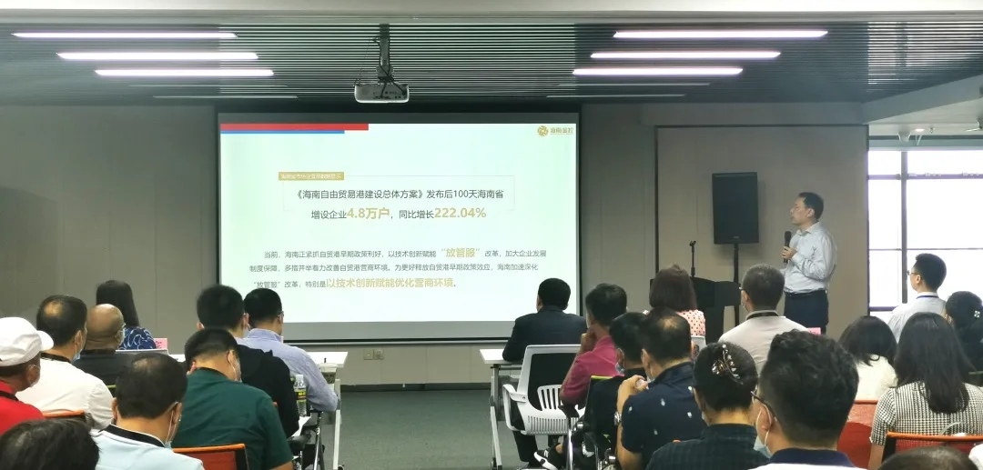 隨后,程棟才向參會企業家代表介紹了海南股交的設立背景、服務定位、金融產品及海南自貿港相關稅收政策等內容,分享了公司成立以來助力海南經濟發展和在服務我省中小微企業方面的成就與案例。他表示,海南是一塊充滿希望和活力的創業興業熱土,干事創業氛圍濃厚,在海南自貿港建設發展的新形勢下,希望更多的省外企業把握商機,不斷加深對海南的認識了解,海南股交期待與各省市企業加強交流、主動對接,為項目落地和企業后續發展提供優質高效服務。