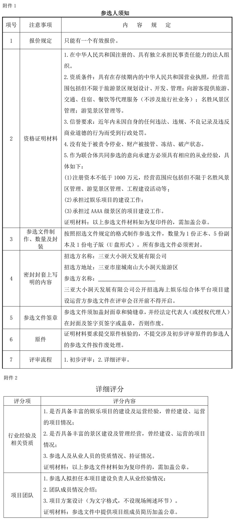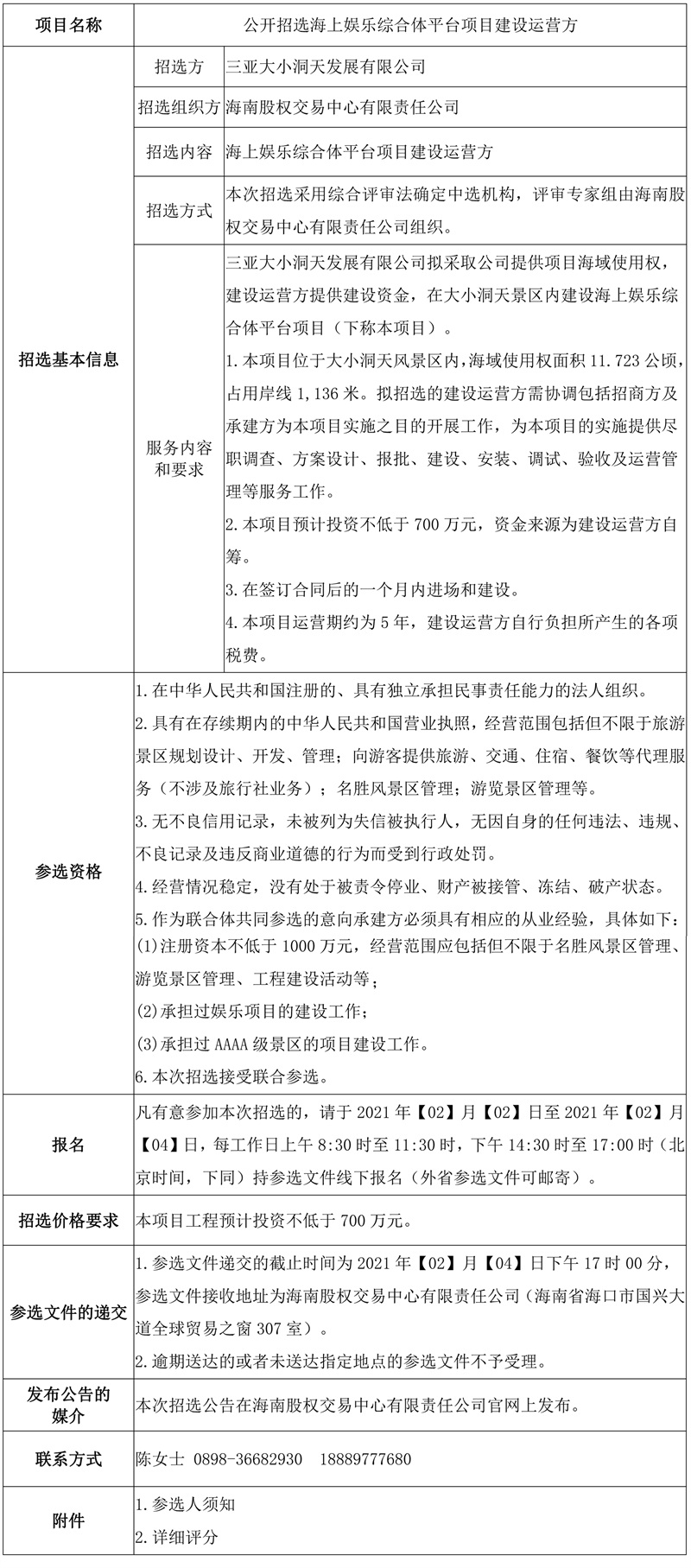 根據相關法律法規,受委托,海南股權交易中心有限責任公司公開招選海上娛樂綜合體平臺項目建設運營方,為三亞大小洞天景區的海上娛樂綜合體平臺項目提供盡職調查、項目報批、建設、生產、安裝、調試、驗收及運營管理等服務工作。歡迎符合條件的機構遵照本公告的有關規定報名參加,現將有關事項公告如下: