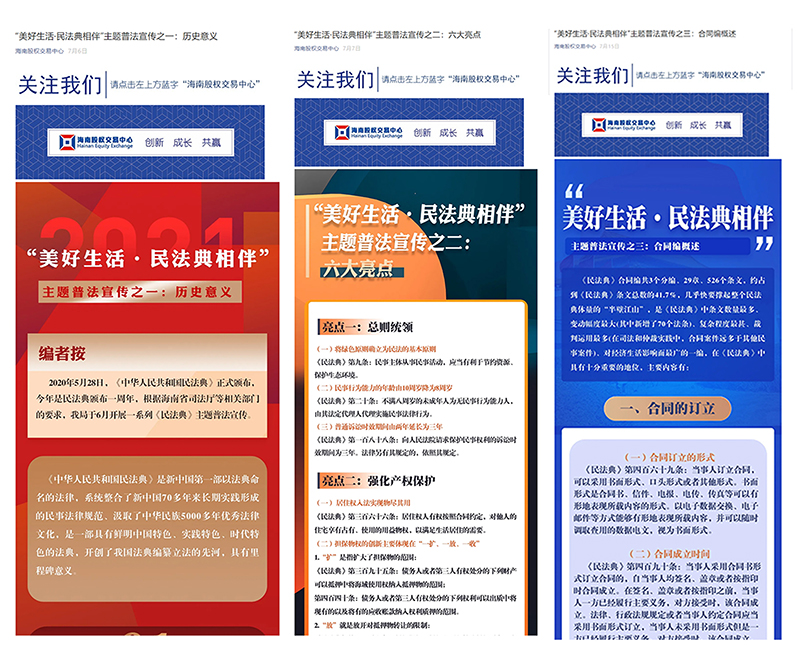 2021年7月7日-29日期間,海南股交通過邀請知名專家、投資機構進行線上授課和微信公眾號平臺轉發“民法典主題普法宣傳”等形式,開展企業培育宣傳活動。其中,線上課程向掛牌公司、展示企業、托管企業尤其是“專精特新”企業定向邀約,邀請企業代表參加《“商業計劃書”系列課程》兩堂線上直播課,直播課在線參與人數922名,活動取得了良好效果。