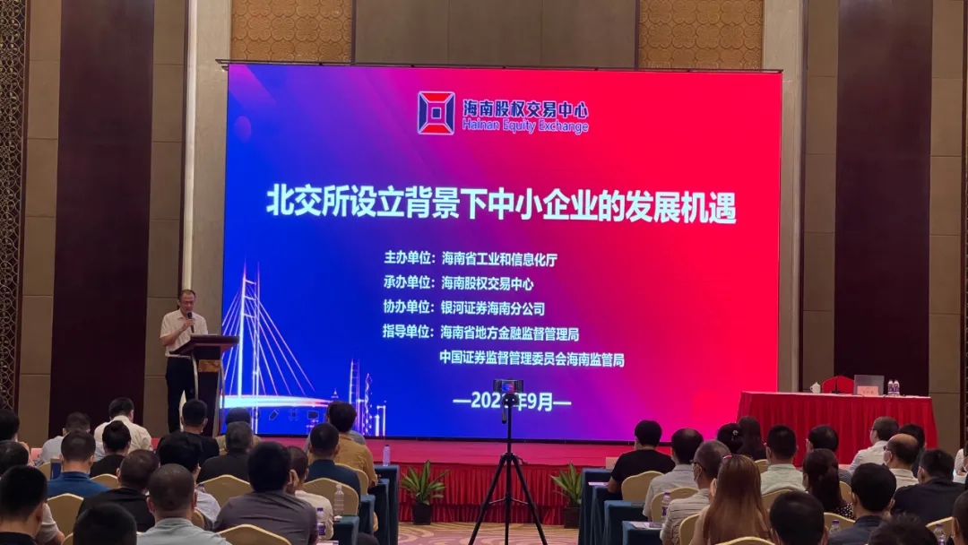 為幫助我省中小企業深入了解北京證券交易所,掌握資本市場的新機遇,9月24日,海南省工業和信息化廳聯合海南股權交易中心邀請業內資深專家舉行“北交所設立背景下中小企業的發展機遇”主題培訓,幫助中小企業熟悉資本市場規則,適應新形勢做好上市路徑規劃。海南省工業和信息化廳、海南省地方金融監督管理局、中國證監會海南監管局、海南省工商聯及我省多家新三板掛牌企業、重點上市后備企業、專精特新企業代表和金融機構、投資機構、券商、商協會代表約200人參加活動。