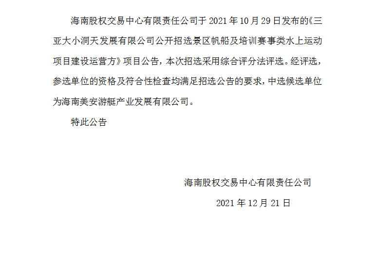 三亞大小洞天發展有限公司公開招選景區帆船及培訓賽事類水上運動項目建設運營方結果公告