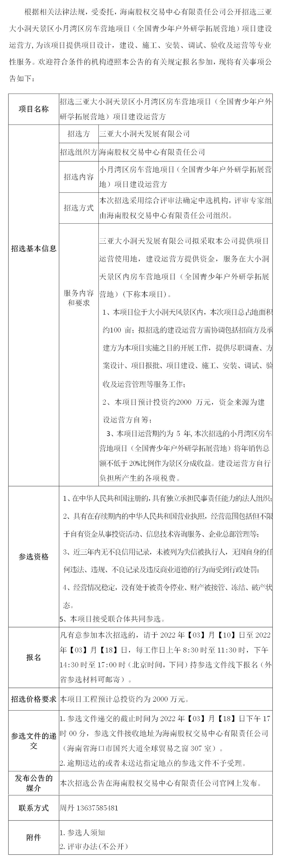 三亞大小洞天發展有限公司公開招選小月灣區房車營地項目(全國青少年戶外研學拓展營地)建設運營方
