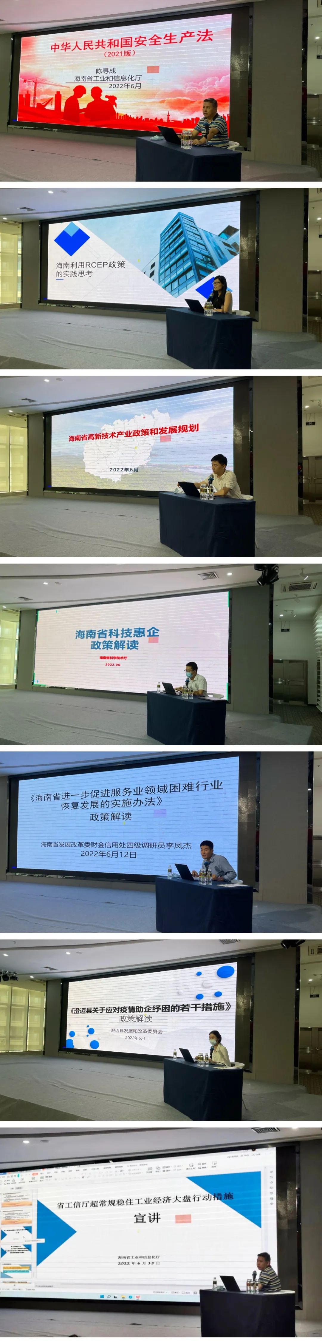會上,海南省工業和信息化廳、海南省科學技術廳、海南省發展和改革委員會、澄邁縣發展和改革委員會等相關部門針對我省中小企業紓困扶持政策進行宣貫,重點解讀了《保障中小企業款項支付條例》《安全生產法》《海南工信財政措施實施細則》《海南省工信廳超常規穩住工業經濟大盤行動措施》《海南省高新技術產業政策和發展規劃》《海南利用RCEP政策的實踐思考》《海南省獲批國家級研發設計平臺資助實施細則》《海南省科技型中小企業認定管理暫行辦法》《海南省進一步促進服務業領域困難行業恢復發展實施辦法》《澄邁縣關于應對疫情助企紓困的若干措施》等一系列關于幫扶中小企業的政策。