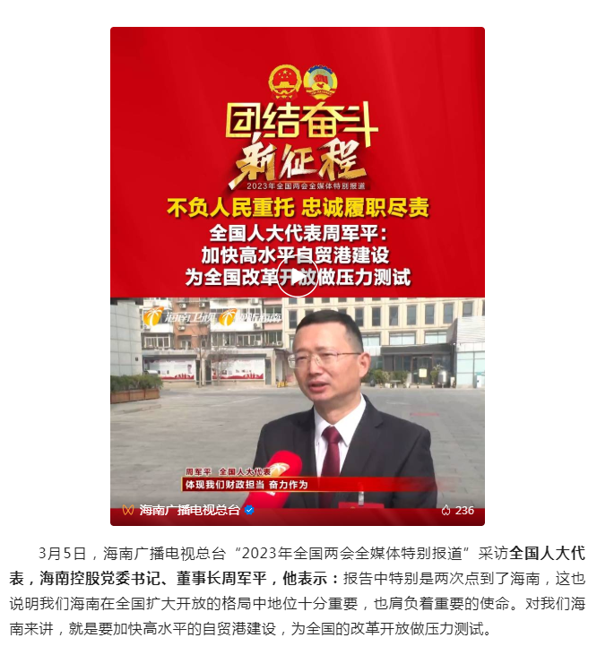 近日來,新華社、經濟參考報、海南日報、海南廣播電視總臺等多家媒體,先后采訪了全國人大代表、海南控股黨委書記、董事長周軍平,他圍繞高水平推動海南自貿港建設、恢復和擴大消費、全島封關運作“一號工程”等主題談體會、話發(fā)展。