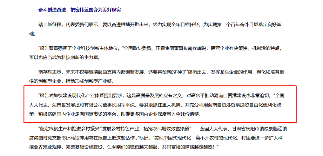 “報告對加快建設現代化產業(yè)體系提出要求,這是高質量發(fā)展的應有之義,對高水平推動海南自貿港建設也非常迫切。”全國人大代表、海南省發(fā)展控股有限公司董事長周軍平說,要緊緊抓住重大機遇,并充分利用海南自貿港貿易投資自由化便利化政策,積極搭建國內企業(yè)走向國際市場的平臺,助推更多國內企業(yè)深度融入全球價值鏈。