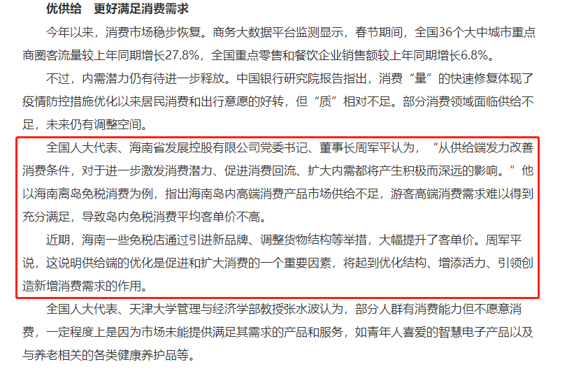 報道圍繞“如何讓消費‘熱’起來?怎樣解決不便消費、不愿消費、不敢消費等突出問題以釋放消費潛力?”采訪全國兩會代表委員。報道提及:全國人大代表、海南省發(fā)展控股有限公司黨委書記、董事長周軍平認為,“從供給端發(fā)力改善消費條件,對于進一步激發(fā)消費潛力、促進消費回流、擴大內需都將產生積極而深遠的影響。”他以海南離島免稅消費為例,指出海南島內高端消費產品市場供給不足,游客高端消費需求難以得到充分滿足,導致島內免稅消費平均客單價不高。近期,海南一些免稅店通過引進新品牌、調整貨物結構等舉措,大幅提升了客單價。周軍平說,這說明供給端的優(yōu)化是促進和擴大消費的一個重要因素,將起到優(yōu)化結構、增添活力、引領創(chuàng)造新增消費需求的作用。