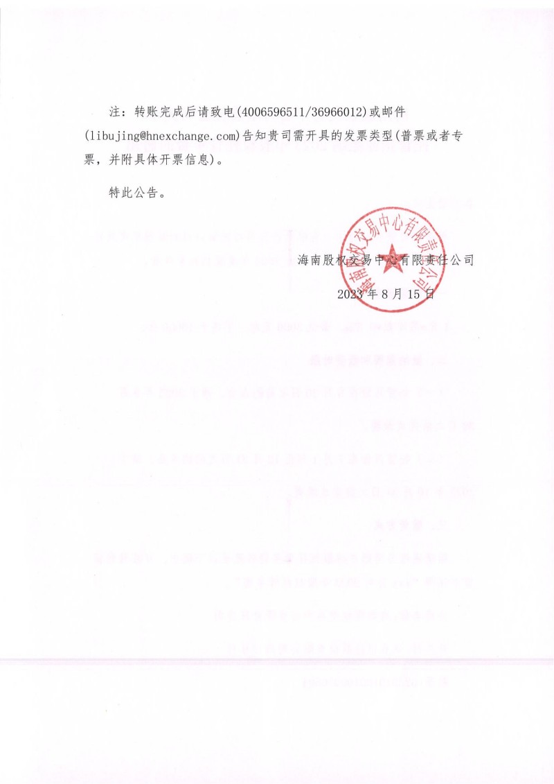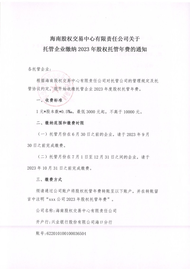 海南股權交易中心有限責任公司關于托管企業繳納2023年股權托管年費的通知
