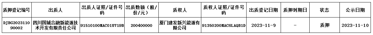 海南國城常青投資合伙企業(有限合伙)(企業代碼:993906)合伙人“四川國城合融新能源技術開發有限責任公司”于2023年11月9日在我中心辦理了財產份額質押登記業務,具體情況如下: