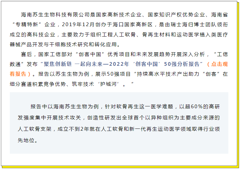 其中來自海南蘇生生物科技有限公司的“人工軟骨和新一代再生運動醫學”項目入圍總決賽50強,并在最終榮獲總決賽50強第11名,是獲獎企業組項目中成立時間最短、發展最快的項目之一。