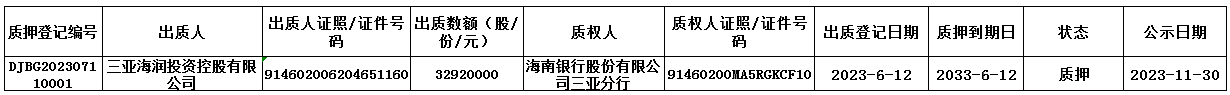 海南海潤珍珠股份有限公司(企業代碼:993883)股東三亞海潤投資控股有限公司于2023年7月11日在我中心辦理了股權質押登記業務,具體情況如下: