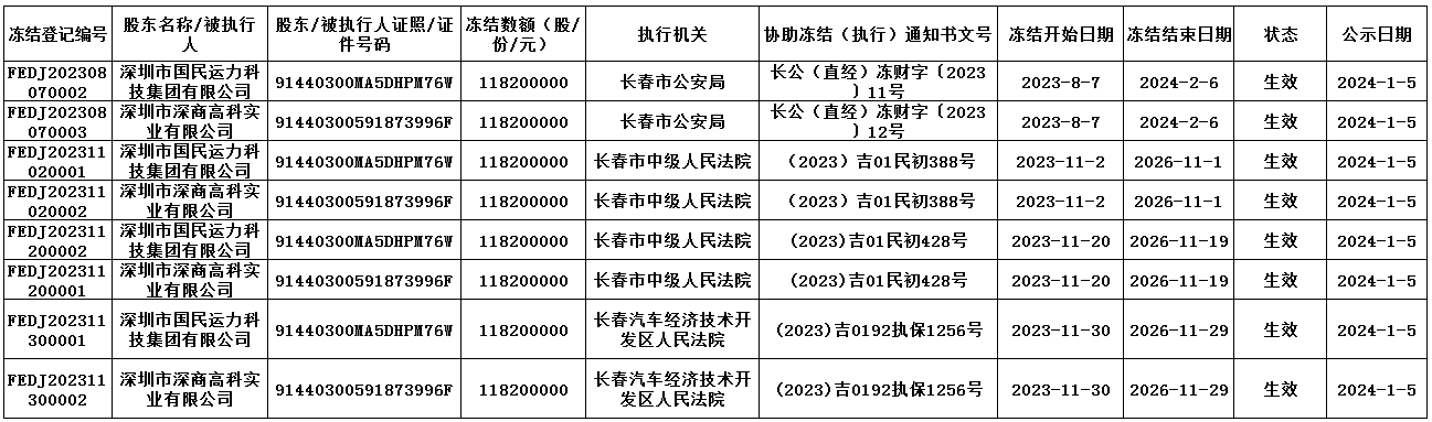 依據(jù)長春市公安局《協(xié)助凍結財產(chǎn)通知書》[長公(直經(jīng))凍財字〔2023〕11號)]、長春市人民法院《協(xié)助執(zhí)行通知書》[(2023)吉01民初388號]及長春汽車經(jīng)濟技術開發(fā)區(qū)人民法院[(2023)吉0192執(zhí)保1256號]等文件,我中心為海口聯(lián)合農(nóng)村商業(yè)銀行股份有限公司(企業(yè)代碼:893529)股東深圳市國民運力科技集團有限公司、深圳市深商高科實業(yè)有限公司辦理股權凍結/股權輪候凍結登記,具體情況如下:
