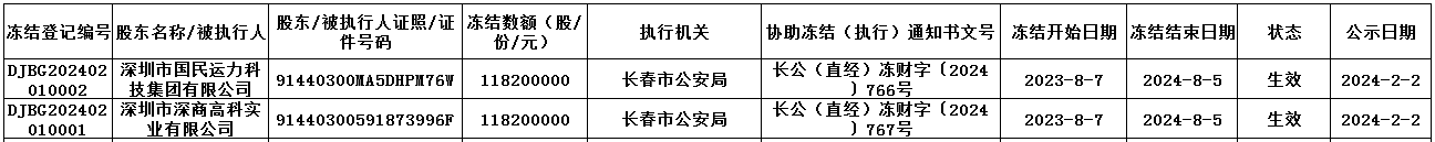 依據長春市公安局《協助凍結財產通知書》[長公(直經)凍財字〔2024〕766號]、[長公(直經)凍財字〔2024〕767號],我中心為海口聯合農村商業銀行股份有限公司(企業代碼:893529)股東深圳市國民運力科技集團有限公司、深圳市深商高科實業有限公司辦理股權凍結延期登記,具體情況如下: