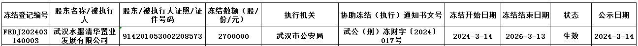 依據武漢市公安局《協助凍結財產通知書》[武公(刑)凍財字〔2024〕017號]文件,我中心為海南瓊中長江村鎮銀行股份有限公司(企業代碼:893525)股東武漢水墨清華置業發展有限公司辦理股權凍結登記,具體情況如下: