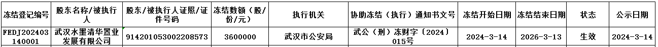 依據(jù)武漢市公安局《協(xié)助凍結(jié)財產(chǎn)通知書》[武公(刑)凍財字〔2024〕015號]文件,我中心為海南屯昌長江村鎮(zhèn)銀行股份有限公司(企業(yè)代碼:893524)股東武漢水墨清華置業(yè)發(fā)展有限公司辦理股權(quán)凍結(jié)登記,具體情況如下:
